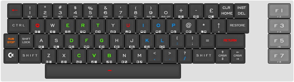 If you’re a visual person, here’s a color-coded map I made of the Wolfenstein keyboard controls (C64 version). If you’re not a visual person, read on, I also have written keyboard instructions for Wolfenstein.